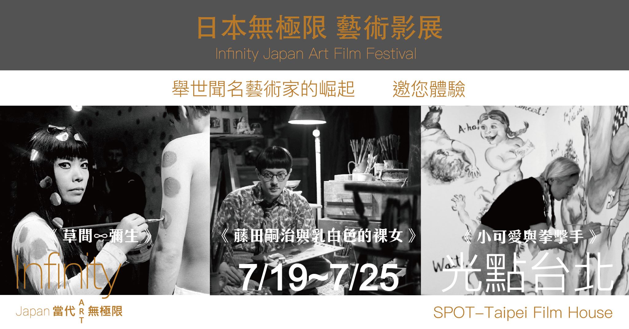 本次影展結合了第七屆「Infinity Japan 日本無極限」藝博會,「日本藝術影展」將作為藝博會的前導,透過電影追溯藝術家創作的源頭,了解其對藝術創作的背後意義。除了播映前衛女王——草間彌生、巴黎畫派的知名東洋畫家藤田嗣治等藝術電影,現場將同步展出藝術品,讓觀眾能以不同的角度欣賞和體驗日本藝術。