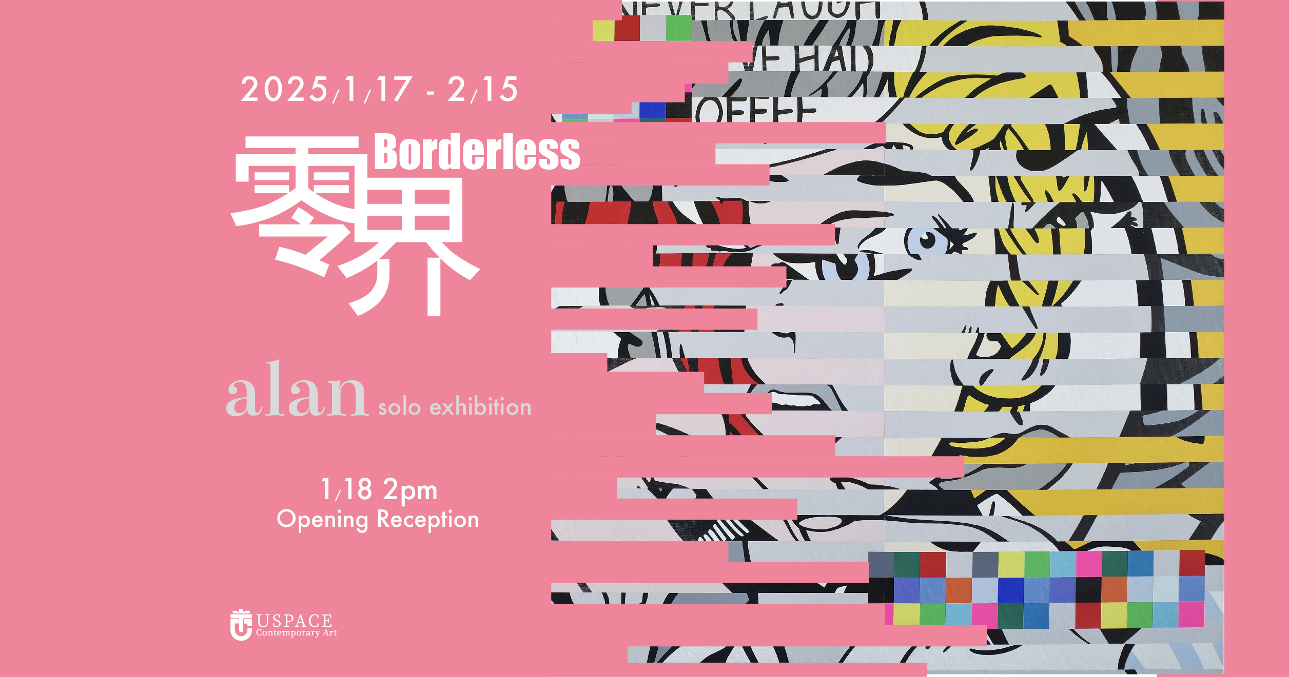 在近年受到當代藝術圈關注的alan,自述在1990年代的青少年時期,受到當時日本的文化與哲學深深地影響,並在感受力上留下了持久印記。1990年代的精髓——包括時尚、運動鞋、銀飾品、腕錶、藝術、音樂、喜劇、八卦、次文化以及動畫——作為一條核心線索貫穿於alan的創作中。而在COVID-19疫情期間的自我隔離經歷,為其提供了一次難得的內省機會,也導致了藝術創作方式的重大轉變。他的藝術風格從本能性的繪畫逐漸演變為更注重概念深度的表現形式。此次個展《Borderless》中展出的作品,是圍繞「Under50%+point」的概念創作,邀請觀眾探索色彩在具象與抽象轉換之間所呈現出的獨特平衡與相互作用。